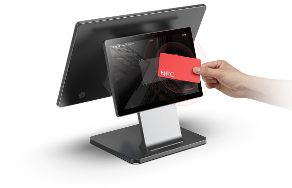 A sleek point-of-sale system with a 15.6" main touchscreen and a 10" rear contactless display for smooth, customer-facing payments. Made for efficiency in retail and hospitality settings.